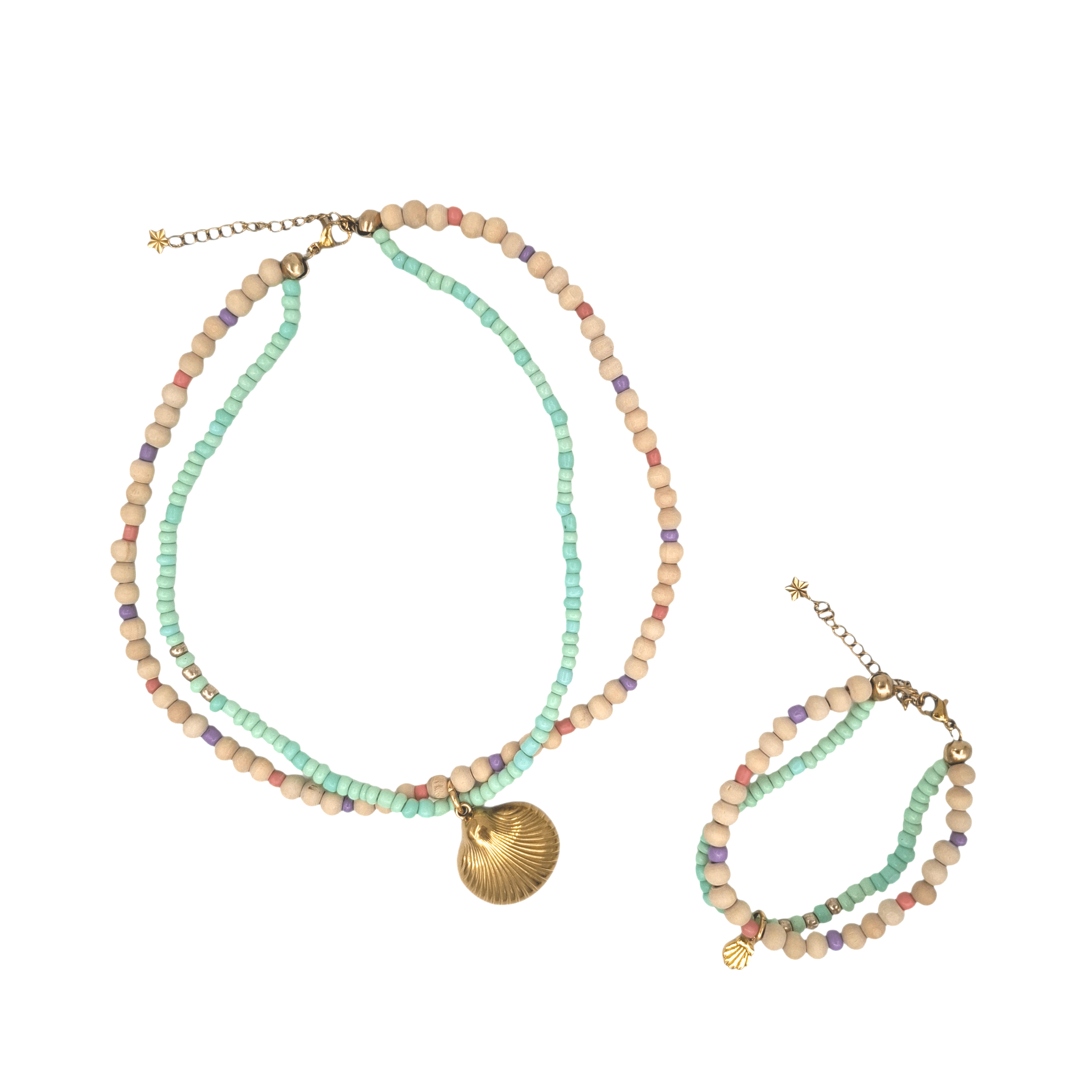 Deze stijlvolle dubbele armband straalt een zachte, zomerse sfeer uit. De combinatie van natuurlijke beige kralen, mintgroene accenten en kleine pastelkleurige details geeft de ketting een rustige maar speelse uitstraling.