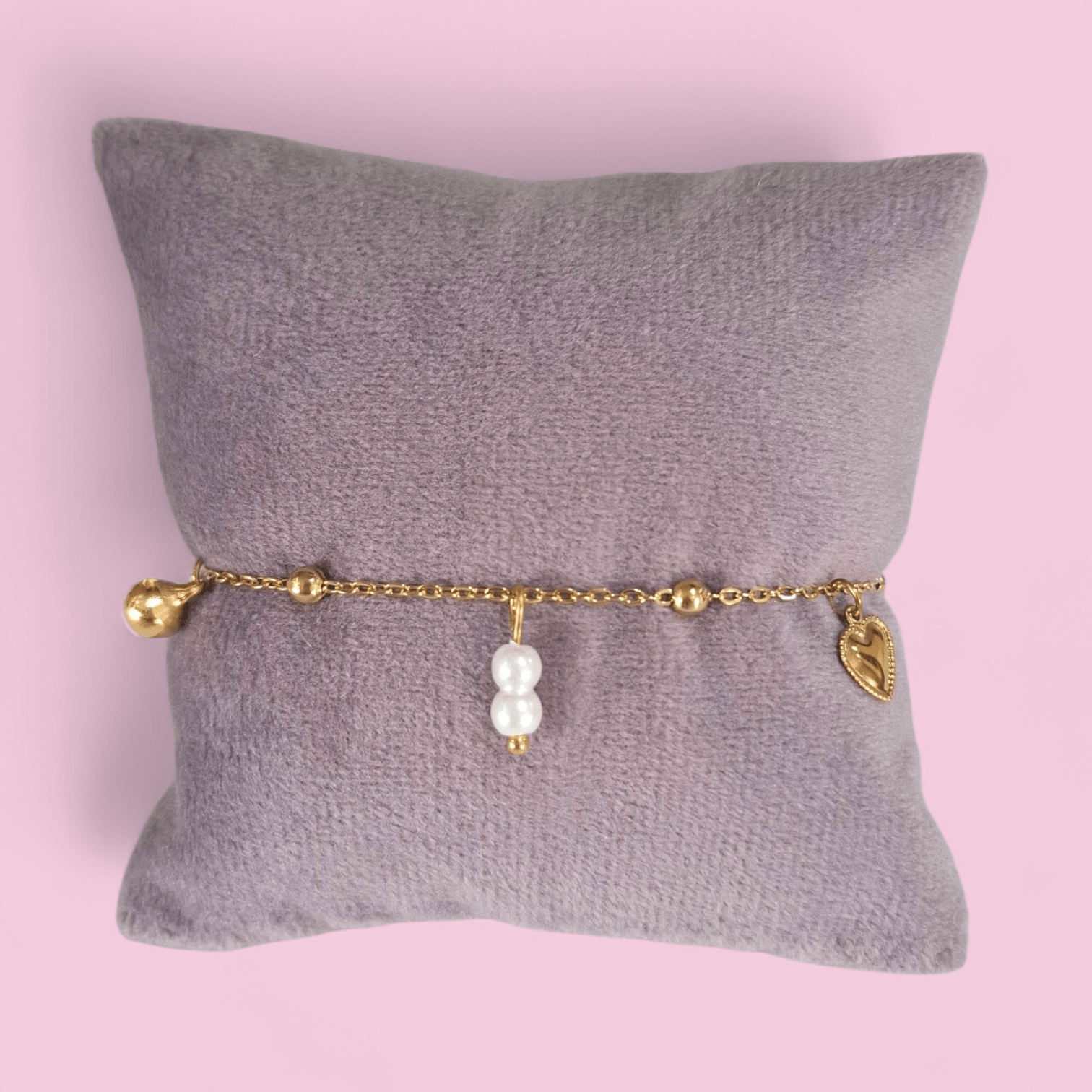 Deze speelse en elegante gouden armband is een prachtig sieraad voor jonge meiden. De armband is versierd met verschillende bedels: een lief roze hartje, een glanzend gouden hartje, zachte witte pareltjes en een klein belletje dat subtiel rinkelt bij beweging.