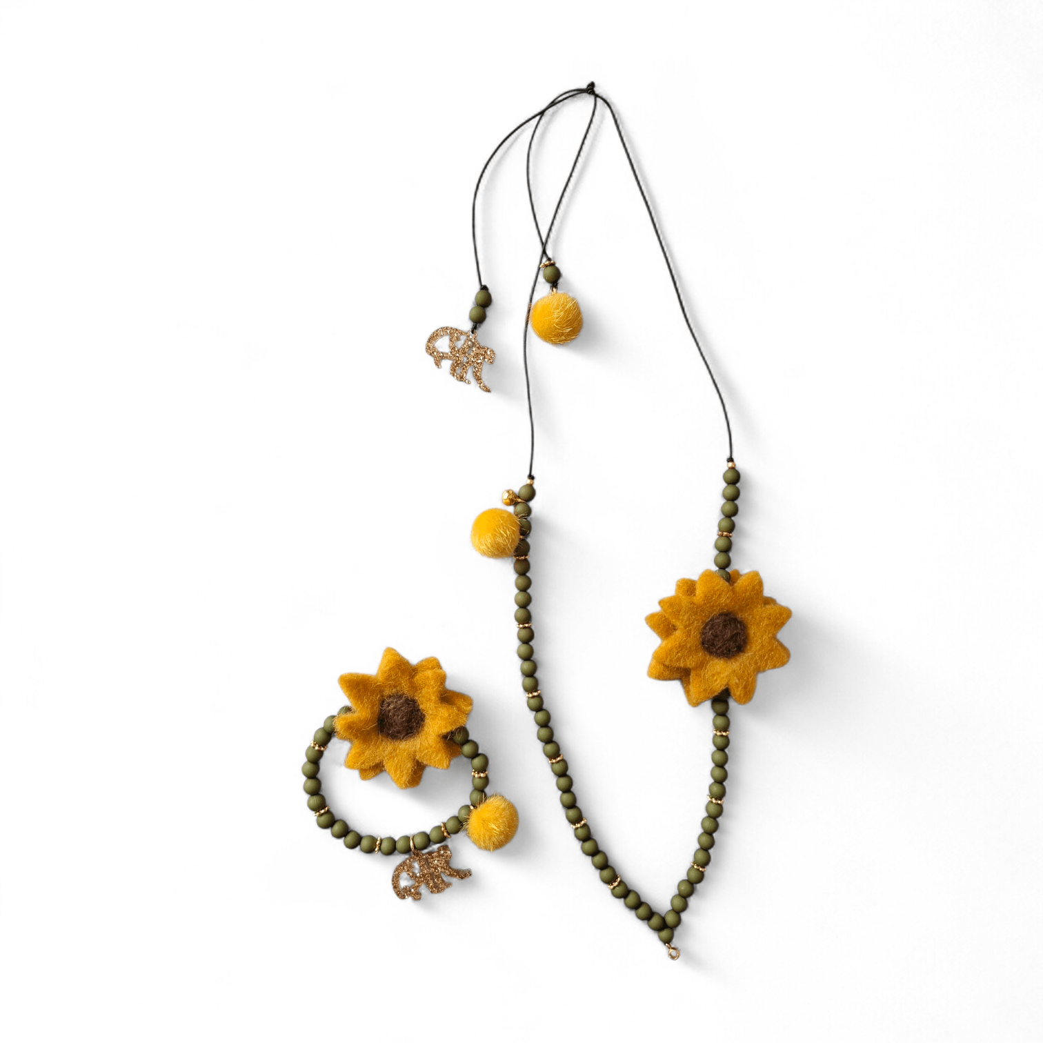 Een vrolijke armband die meteen een glimlach brengt. Met zachte kralen, een speelse pompon en een handgemaakte zonnebloem is dit het perfecte sieraad voor kleine zonnestraaltjes.