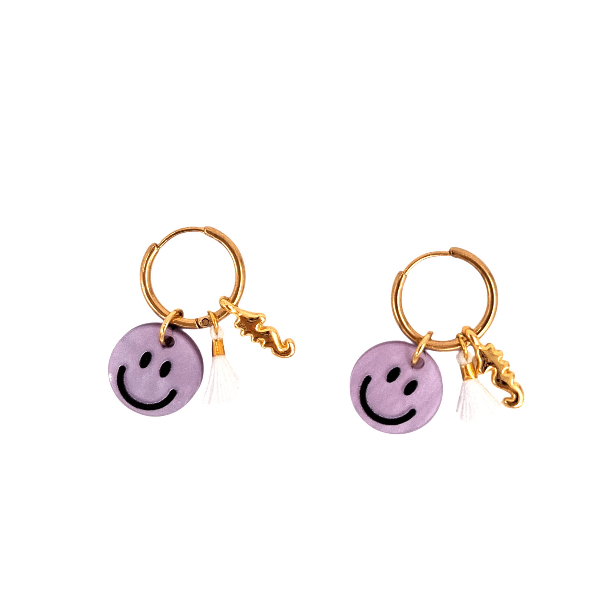 Maak elke dag een beetje vrolijker met deze gouden oorbellen met een paarse smiley en schattige gouden zeepaardjes. Een speelse combinatie van kleur en charme. De glimlachende paarse bedel zorgt voor een vrolijke touch, terwijl de zeepaardjes een magisch onderwatergevoel geven. Lichtgewicht en comfortabel om te dragen — ideaal voor school, feestjes of als lief cadeautje.